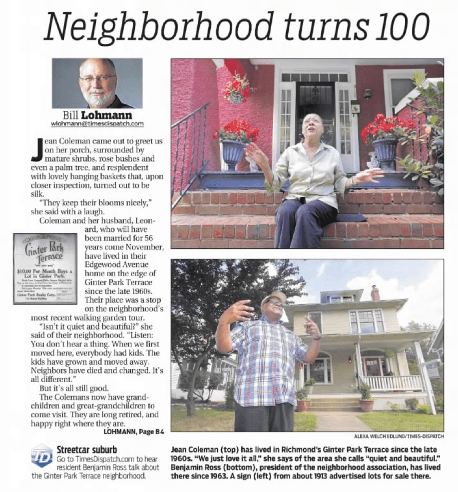 The triangular-shaped Ginter Park Terrace is bordered by Brookland Park Boulevard and Ladies Mile Road, with Pollard Park serving as the gateway into the beautiful neighborhood.