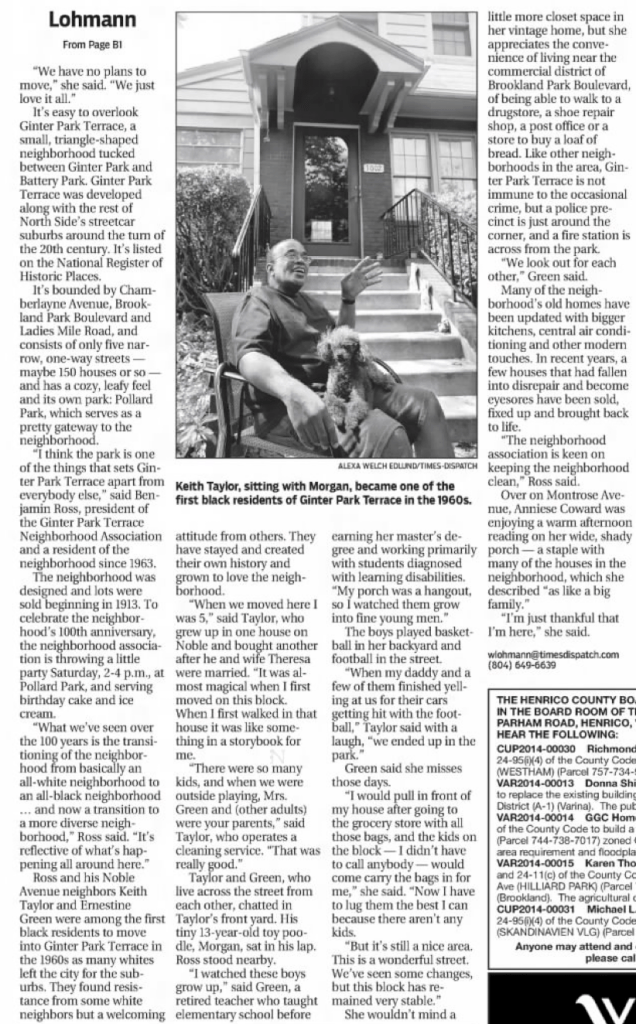 Ginter Park Terrace is one of several neighborhoods developed north of the city during the early 20th century. The neighborhood was first subdivided and marketed in 1913 along the streetcar line.